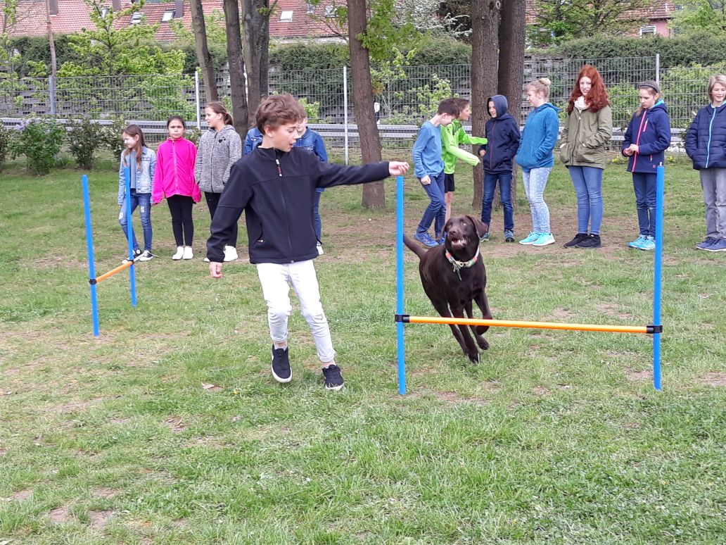 In der Ausbildung wird außerdem der sichere Umgang zwischen Hund und Kindern vermittelt. Die Schülerinnen und Schüler lernen, wie sie sich gegenüber dem Hund respektvoll und achtsam verhalten. Dazu gehören Regeln wie ruhiges Annähern, kein Ziehen oder Bedrängen sowie das Beachten der Körpersprache des Hundes.